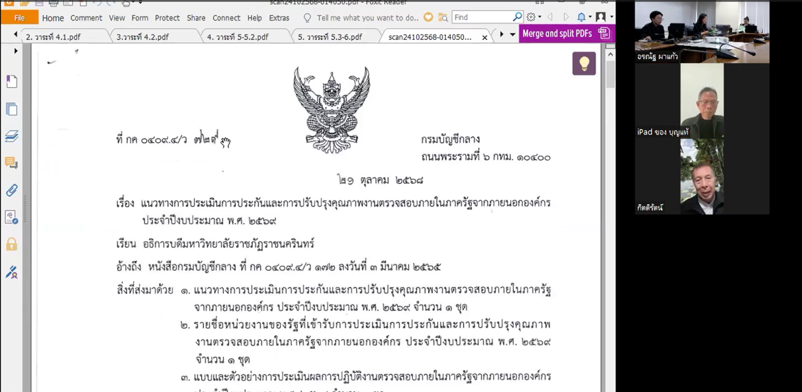 เมื่อวันที่ 28 ตุลาคม 2568 หน่วยตรวจสอบภายในจัดการประชุมคณะกรรมการตรวจสอบ ครั้งที่ 7/2568 ผ่านสื่ออิเล็กทรอนิกส์ เพื่อพิจารณาให้ความเห็นชอบรายงานผลการตรวจสอบ ตามแผนการตรวจสอบภายในประจำปีงบประมาณ พ.ศ. 2568 รับทราบการปฏิบัติตามมติที่ประชุมคณะกรรมการตรวจสอบ ครั้งที่ 5/2568 และ 6/2568, รายงานติดตามผลการปรับปรุงแก้ไขของหน่วยรับตรวจ, คู่มือคณะกรรมการตรวจสอบสำหรับหน่วยงานของรัฐ และหนังสือกรมบัญชีกลาง เรื่องแนวทางการประกันและการปรับปรุงคุณภาพงานตรวจสอบภายในภาครัฐจากภายนอกองค์กร ประจำปีงบประมาณ พ.ศ. 2569